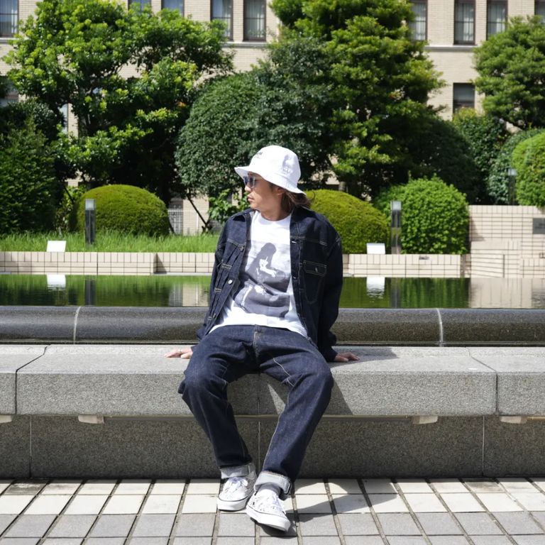 ○13.5ozのオリジナルインディゴセルヴィッチデニムを敢えて生機(キバタ)のまま採用。洗い方、そして乾燥方法にまでこだわったウォッシュド加工を施し、生機特有の風合いを最大限に活かしつつも軽さと着心地の良さを両立させたルーズシルエットのトラッカージャケット
