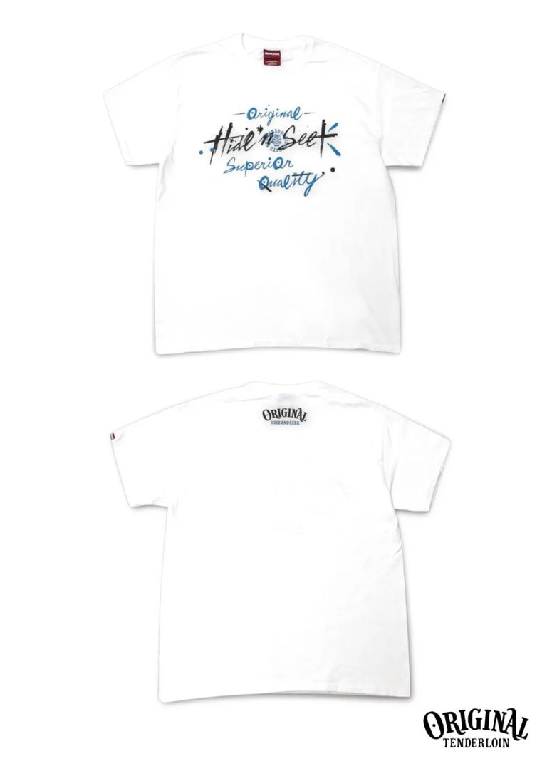 ○フロントに今回のコラボレーションを象徴するテンダーロインのデザインをハイドアンドシークに落とし込んだグラフィック、バックにテンダーロインを象徴するロゴとハイドアンドシークのロゴをMIXしたロゴをプリント。