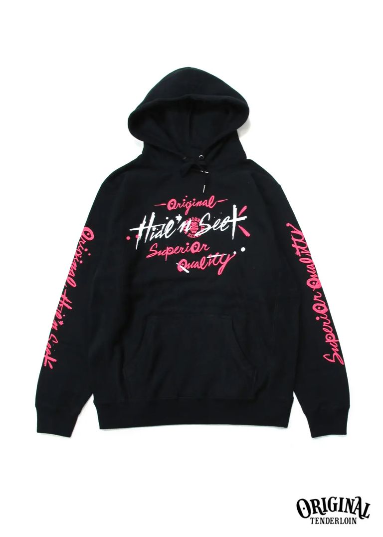 ○フロント、両袖に今回のコラボレーションを象徴するテンダーロインのデザインをハイドアンドシークに落とし込んだグラフィックをプリント。